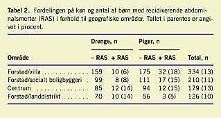 Gennemsnitsalderen for børn med og uden abdominal-smerter var den samme (10,8 år). Der var signifikant (p< 0,003) flere piger end drenge i 11-års-alderen med RAS (Tabel 1). Kønsfordelingen og prævalensen af RAS i forhold til geografisk område fremgår af Tabel 2 . I området forstad/villa var der signifikant flere piger end drenge med RAS (p< 0,002). I forstad/landdistrikt var der tendens til en højere prævalens af RAS blandt drenge, men forskellen var ikke signifikant.
