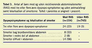 Af de 104 børn med RAS havde 24 (23%) tre eller flere symptomer på øvre dyspepsi, og der var svaret benægtende på astma/allergi-spørgsmålet. Til sammenligning gjaldt det kun for 19 (3%) børn uden RAS (p< 0,0001) (Tabel 3 ). Otte af de 24 børn med RAS, havde smerter i den øvre del af abdomen eller bag brystbenet og opfyldte derved definitionen på øvre dyspepsi. Dette svarer til, at under 1% af de 849 deltagende børn havde øvre dyspepsi.