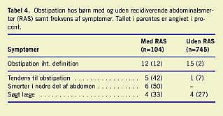 I gruppen af børn med RAS opfyldte 12 (12%) kriterierne for obstipation, dette var signifikant flere end i gruppen uden smerter. Kun fem (42%) af børnene beskrev subjektivt en tendens til obstipation. Dette tyder på, at ikke alle symptomer på obstipation blev opfattet som et problem af barnet eller forældrene, denne tendens er ligeledes fundet af Bock et al [11].