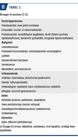 Ascites er en klinisk manifestation, som ses ved en række sygdomme (Tabel 1). I 85% af tilfældene er ascites forårsaget af levercirrose [1]. Nefrotisk syndrom klassificeres som ødemer, hypoalbuminæmi, proteinuri > 3,5 g/døgn og oftest hyperkolesterolæmi. Hos børn vil ødemerne typisk være til stede periorbitalt og/eller som ascites. Hos voksne findes ødemerne typisk deklivt, periorbitalt og i sjældne tilfælde som ascites –
