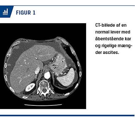Pga. behov for hyppige ascitestapninger blev patienten henvist til en hepatologisk afdeling til vurdering af anlæggelse af en transjugulær intrahepatisk portosystemisk shunt. Levervenekaterisationen viste et normalt portaltryk på 7 mmHg. CT af leveren viste en normal lever og ascites (Figur 1). En urinstiks viste +3 for protein, og døgnurinsopsamling viste proteinuri på 8,3 g/døgn. Der var negative resultater ved bestemmelse af antinukleære antistoffer, antineutrofile cytoplasmatiske antistoffer og M-komponent samt normalt niveau af glykeret hæmoglobin. Blodtrykket var 110/63 mmHg, og der var ingen deklive ødemer. Man havde mistanke om nefrotisk syndrom som årsag til den recidiverende ascites. En nyrebiopsi viste MG. Anti-fosfolipase-A2-receptor (PLA2R)-niveauet var forhøjet, hvilket tydede på primær MG pga. autoimmunsygdom. Udredning for sekundære årsager (hiv, hepatitis og malignitet) var negativ. Patienten blev pga. det høje proteinuri niveau og den recidiverende ascites behandlet med tablet prednisolon 40 mg samt tablet azathioprin 100 mg dagligt.