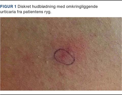 En 16-årig pige blev indlagt med et døgns feber, opkastninger, nakkesmerter og fotofobi. Ved indlæggelsen var hun klinisk stabil og ikke meningeal. Der blev fundet fire mikropetekkier (se Figur 1). CRP-koncentrationen var 99 mg/l. Spinalvæsken (CSV) var klar og uden pleocytose. Initial behandling for MS med ceftriaxon givet i.v. udløste en akut allergisk reaktion, og behandlingen blev omlagt til meropenem. Den følgende dag var patienten feberfri og upåvirket. Hun fik i.v.-antibiotika i tre dage og derefter peroral behandling med clindamycin og ciprofloxacin i en uge.