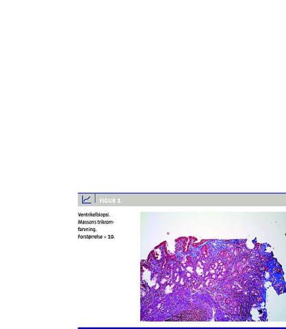 På biopsier fra ventriklen blev der påvist kronisk inflammation, et vekslende udbredt, kraftigt fortykket subepitelialt bindevævslag (>10 mikrometer) samt infiltration af eosinofile lymfocytter og plasmaceller i lamina propria, hvilket er foreneligt med diagnosen KG (Figur 1 ).