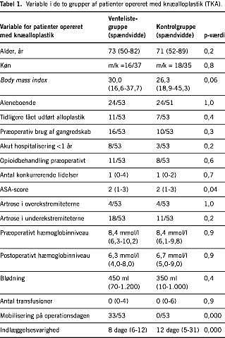 For TKA-patienterne er grupperne sammenlignelige mht. de registrerede variable - fraset ASA-score (dårligere i ventelistegruppen), mobilisering på operationsdagen (kun ventelistegruppen) og indlæggelsesvarighed (Tabel 1).