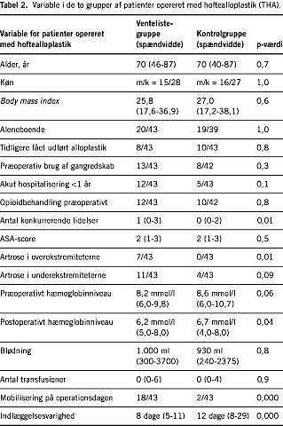 For THA-patienterne er grupperne sammenlignelige mht. de registrerede variable - fraset antallet af konkurrerende lidelser (flest i ventelistegruppen), mobiliseringshindrende lidelser i overekstremiteterne (flest i ventelistegruppen), postoperativt hæmoglobinniveau (lavest i ventelistegruppen), mobilisering på operationsdagen (flest i ventelistegruppen) og indlæggelsesvarighed (Tabel 2).