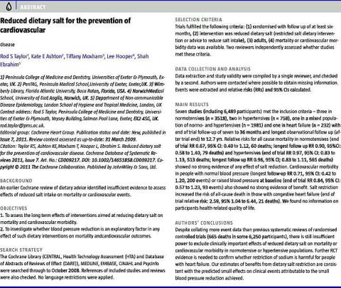 <li>Taylor RS, Ashton KE, Moxham T et al. Reduced dietary salt for the prevention of cardiovascular disease. Cochrane Database Syst Rev 2011;(7):CD009217.</li>