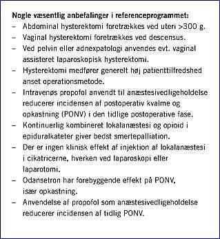 Referenceprogrammet omhandler mange kliniske problemstillinger i forbindelse med hysterektomi på benign indikation, både hvad angår operationen, anæstesi, smertebehandling, pleje, antibiotikabehandling og forebyggelse af tromboemoliske komplikationer. I det følgende er nogle af de væsentlige konklusioner trukket frem.