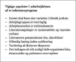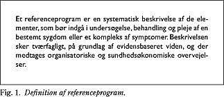 I 1997 rettede Sundhedsstyrelsen henvendelse til Dansk Medicinsk Selskab med henblik på oprettelsen af et sekretariat som støtte for de videnskabelige selskaber og andre, der ønskede at udarbejde landsdækkende referenceprogrammer. Sekretariatet blev etableret som en selvstændig institution, Sekretariat for Referenceprogrammer (SfR), i sommeren 2000 (1). SfR definerer et referenceprogram som en systematisk beskrivelse af de elementer, som bør indgå i behandling, mv. af en bestemt sygdom eller et kompleks af symptomer (Fig. 1 ). SfR valgte fra begyndelsen at følge det koncept, som The Scottish Intercollegiate Guidelines Network (SIGN) i en lang årrække havde anvendt i udarbejdelsen af nationale skotske referenceprogrammer. Konceptet indebærer, at de landsdækkende danske referenceprogrammer er evidensbaserede, de er tværfaglige, dvs. de involverer både den primære og den sekundære sundhedssektor, relevante lægelige specialer samt andre faggrupper, og de forsøger at integrere organisatoriske og sundhedsøkonomiske overvejelser samt patientsynspunkter i selve programmet.