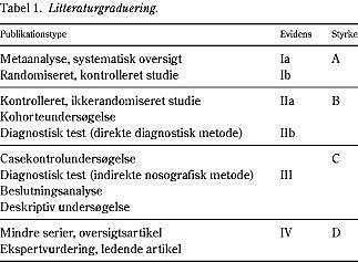 Klare, evidensbaserede anbefalinger i et referenceprogram vil kunne lette klinikeren i den kliniske beslutningsproces samt gøre beslutningsprocessen mere objektiv. Dette gælder både ved behandling af den konkrete patient, men også ved udarbejdelsen af retningslinjer og instruksbøger på afdelingen. Kvaliteten af tidligere referenceprogrammer (guidelines) er meget svingende, hvor den største mangel ofte er en insufficient beskrivelse af referenceprogrammernes evidensgrundlag (2, 3). SfR's referenceprogrammer lever umiddelbart op til de kvalitetskrav, der stilles af den europæiske Assessment of Guidelines Research and Evaluation (AGREE)-collaboration, da alle referenceprogrammerne bygger på en systematisk litteratursøgning efterfulgt af en kritisk gennemgang af den fundne litteratur med særlig vægt på studiernes metodologiske kvaliteter. Anbefalingerne i referenceprogrammet er ledsaget af et evidensniveau A til D, hvor et A indikerer, at mængden af underbyggende evidens er stor og entydig; mens et D indikerer, at mængden af evidens er lille og usikker; men at arbejdsgruppens medlemmer ud fra deres erfaring kan stå inde for den anførte anbefaling (Tabel 1 ). Det er således forholdsvis let for den enkelte fagperson at vurdere, om egen og afdelingens udredning og behandling er i overensstemmelse med referenceprogrammet.