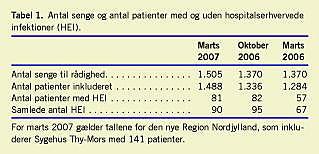 Tabel 1 viser antal senge til rådighed, antal patienter inkluderet i undersøgelsen, antal patienter med HEI og det samlede antal HEI. Andelen af patienter, der indgik i undersøgelsen, udgjorde henholdsvis 93,7%, 97,5% og 98,9% af antal senge, der var til rådighed. Endvidere viser tabellen, a t enkelte patienter havde flere HEI, således at det samlede antal af HEI oversteg antallet af patienter.