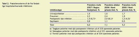 Tabel 2 viser prævalensraten af de fire forskellige HEI og den samlede prævalensrate i de tre undersøgelser. Prævalensraten steg fra 5,2% til 7,1% (ikke signifikant) i de to første undersøgelser og endte på 6,0% i den tredje undersøgelse. For postoperativ dyb infektion viser tallene i parentes en prævalensrate udregnet på baggrund af antal opererede patienter under den pågældende indlæggelse. Der var en stigning i antallet af postoperative dybe infektioner fra første til anden undersøgelse, men den var ikke signifikant (0,05 < p < 0,1).