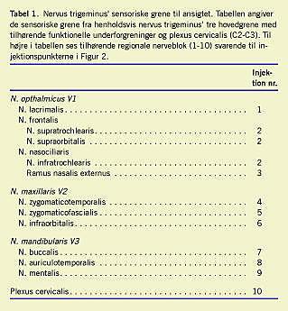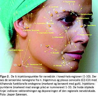 Summary Regional nerve block anaesthesia for facial surgery Ugeskr Læger 2008;170(7):513-517 Regional nerve blocking techniques offer a suitable alternative to local infiltration anaesthesia for facial soft tissue-surgery. Moreover, they present several advantages over general anaesthesia, including smoother recovery, fewer side effects, residual analgesia into the postoperative period, earlier discharge from the recovery room and reduced costs. The branches of the trigeminal nerve and the sensory nerves originating from the upper cervical plexus can be targeted at several anatomical locations. We summarize current knowledge on facial nerve block techniques and recommend 10 nerve blocks providing efficient anaesthesia for the entire head and upper-neck region.