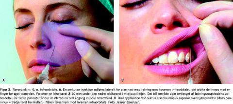 N. infraorbitalis træder ud gennem foramen infraorbitale og er lokaliseret 8-10 mm under den nedre orbitarand umiddelbart medialt for midtpupillær linjen. Nerven kan blokeres ved perkutan eller intraoral adgang. Den perkutane adgang udføres med en injektion lateralt for ala nasi med nålen rettet opad lateralt (Figur 3A). Der deponeres 2 ml lokalanæstesi; det bedøvede område kan ses på figuren. Den intraorale adgang beskrives sædvanligvis som den mest pålidelige og mindst smertevoldende. Nålen lægges an mod sulcus alveololabialis superior svarende til basis af tredje tand og føres op mod venstre tredje finger, som hviler på foramen (Figur 3B) [4, 10, 13].