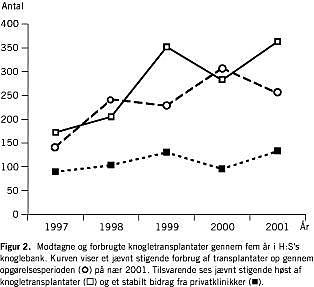Data vedrørende modtaget og forbrugt knogle i undersøgelsesperioden fremgår af Figur 2 . Kurven viser, at vi har været i stand til at følge med den stigende efterspørgsel primært gennem en øget høst af knogletransplantater på offentlige sygehuse. Der ses en stor stigning i knoglehøst i 1999, idet Frederiksberg Hospital, der er en elektiv klinik, kom med i samarbejdet. Før den tid høstede man på Frederiksberg Hospital knogle til egen knoglebank. Frederiksberg Hospital har leveret henholdsvis 81, 116 og 158 knogletransplantater i årene 1999, 2000 og 2001. Faldet i knogleleverancen i 2000 skyldes en nedgang i leverancer fra både offentlige sygehuse og private klinikker.