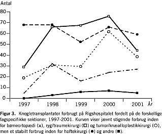 Resultater: Gennem den analyserede femårsperiode ses et generelt jævnt stigende knogleforbrug primært til anvendelse inden for hofterevisionskirurgi og ryg/traumekirurgi. De primære årsager til kassering af knogletransplantater var tekniske fejl og positive dyrkningssvar.