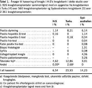 Årsager til kassering af knogletransplantater sammenlignet med, hvad der rapporteres om i litteraturen ses i Tabel 1. Den hyppigste årsag til kassering af knogletransplantater i H:S's knoglebank er tekniske fejl efterfulgt af positive dyrkningssvar og positive hepatitis C-test. I knoglebanken i Turku [4] ses til sammenligning en øget frekvens af tekniske fejl og positive dyrkningssvar som årsager til kassering af knogletransplantater. I Sydaustraliens knoglebank [3] kasseres knogletransplantater hyppigst pga. positive dyrkningssvar, herefter følger udtaget/optøet knogle og positiv patientanamnese. Den forholdsvis større procentvise andel af positive dyrkningssvar i både knoglebanken i Turku [4] og Sydaustraliens knoglebank [3] kan muligvis forklares ved en anden procedure ved prøvetagningen. I H:S's knoglebank udtages en knogleprøve til dyrkning pr. transplantat, hvorimod man i knoglebanken i Turku [4] tager seks prøver i form af swabs fra periost, bruskoverflade og marvkanal til aerob samt anaerob dyrkning. I Sydaustraliens knoglebank [3] udtages ligeledes flere dyrkningsprøver høstet fra knogleoverflade og ledvæske. Salmela et al [5] har vist, at 90% af de positive dyrkninger fra knogletransplantater er falsk positive. Da risikoen for infektion af recipienten trods positiv dyrkning fra transplantatet tilmed er meget lav [6-8], har vi i H:S's knoglebank ikke fundet anledning til at udtage multiple prøver til dyrkning. Den høje frekvens af positive dyrkningssvar i Turku og Sydaustralien kan delvist forklares ved det større antal prøver udtaget til dyrkning. Herudover indgår der i materialet fra Sydaustralien [3] og Turku [4] også knogletransplantater udtaget fra døde donorer, disse transplantater er behæftet med en øget risiko for kontaminering [6]. En direkte sammenligning med disse banker, hvad angår frekvens af positive dyrkningssvar, kan derfor være misvisende. Den relativt lave frekvens af positive dyrkningssvar og tekniske fejl i nærværende materiale gør, at vores kassationsfrekvens er lav, sammenlignet med hvad der rapporteres om i litteraturen [3, 4].
