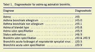 I dette kvantitative tværsnitsstudie er der anvendt aggregerede registerdata på amtsniveau. Studiepopulation og studieperiode: 0-4-årige og 5-14-årige børn med astma og bronkitis i 2001. Data om antal 0-14-årige børn i hvert amt er indhentet fra Statistikbankens database om folketal i tabellen BEF6 [8]. Data om antal akutte indlæggelser er ligeledes indhentet fra Statistikbankens database om indlæggelser på sygehus i tabellen UD1 [8]. Data om genindlæggelser i 2001 er beregnet ved at trække antal patienter, indhentet fra databasen om sygehuspatienter i tabellen PA1A fra den førnævnte tabel om indlæggelser, UD1 [8]. De nævnte data er indhentet på grundlag af følgende diagnosekoder fra Sundhedsvæsenets Klassifikationssystem: J20-22 (akutte infektioner i nedre luftveje) og J40-46 (kroniske sygdomme i nedre luftveje), og de er baseret på patienternes hjemamt [9]. Data om antallet af ambulante konsultationer på sygehuse er indhentet fra Landspatientregisteret (LPR) på grundlag af de diagnosekoder, som er vist i Tabel 1 . Disse data er baseret på sygehusamter. Antallet af konsultationer hos praktiserende speciallæger blev for de 5-14-årige baseret på data fra Sygesikringsregisteret om antallet af ydelser for lungefunktionsmålinger og reversibilitetstest hos praktiserende speciallæger inden for pædiatri og intern medicin. Tilsvarende data for de 0-4-årige var det ikke muligt at anskaffe, da der ikke på små børn foretages astmaspecifikke undersøgelser, som udløser ydelse. Bornholms Regionskommune blev udeladt af opgørelsen, idet området adskiller sig markant fra de øvrige amter, dels på grund af størrelse og dels fordi der ikke findes en børneafdeling på øen. Data for Københavns Amt, Københavns Kommune og Frederiksberg Kommune præsenteres samlet.