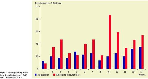 Resultater: Der blev fundet statistisk signifikante forskelle mellem amterne med hensyn til antal indlæggelser pr. 1.000 børn og genindlæggelser (p < 0,01). Der var ligeledes store forskelle mellem amterne i antal ambulante konsultationer pr. 1.000 børn.