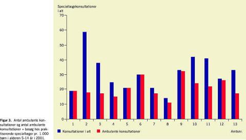 Det fremgår af undersøgelsen, at der var store forskelle mellem amterne i 2001 med hensyn til indlæggelser og antal ambulante konsultationer. Forskellene mellem amterne i antallet af speciallægekonsultationer for aldersgruppen 5-14 år blev yderligere forøget, når antallet af besøg hos praktiserende speciallæger blev inddraget.