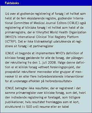 I 2005 vedtog the International Committee of Medical Journal Editors (ICMJE) en politik, der betyder, at forskere, før rekruttering af patienter påbegyndes, skal deponere information om deres undersøgelse til et etableret register over kliniske forsøg [1]. Formålet med dette var at sikre, at information om et klinisk forsøgs eksistens og dets design blev gjort offentligt tilgængelig - et ønske, som ledere inden for evidensbaseret medicin har været talsmænd for i årevis [2]. Vedtagelsen af den politik har forårsaget megen postyr blandt forskere og sponsorer, der frygtede, at det ville blive besværligt at registrere forsøgene, og at det derfor ville lægge en dæmper på konkurrencen. Men reaktionerne på dette krav har alligevel været overvældende. ICMJE lovede at genevaluere regelsættet to år efter, at det var trådt i kraft. I denne artikel opsummeres erfaringerne med fokus på de registre, der overholder regelsættet, de typer af forsøg, der skal registreres, og registreringen af forsøgsresultater. Som altid gælder regler vedtaget af ICMJE udelukkende for de 12 tidsskrifter, der er medlem af ICMJE [3], men mange andre tidsskrifter har indført vores initiale anbefalinger for registrering af forsøg, og vi håber, at de også vil indføre de modifikationer, der bliver diskuteret i denne opdatering.