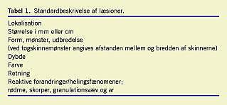 Patienten undersøges afklædt. En detaljeret beskrivelse af læsionerne i huden foretages, idet lokalisation, størrelse, form, dybde, farve, retning og reaktive forandringer beskrives (Tabel 1). Alle læsioner såvel ældre som friske nummereres på figurtegningen og beskrives. Der tages et foto vinkelret på læsionerne med målestok og identifikationsnummer til dokumentation af læsioner og til brug ved eventuel senere retsmedicinsk vurdering.