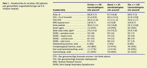 Karakteristika for de første 100 patienter, som gennemførte lungerehabiliterings-programmet, fremgår af (Tabel 1 ). FEV1 i procent af forventet værdi lå på ca. 32. Det vil sige, at det drejer sig om patienter med svær KOL. De fleste af patienterne var holdt op med at ryge inden indgangen i rehabili-teringen. Kun 8% af patienterne fik behandling med ilt i hjemmet, mens 40% brugte et forstøverapparat. Den initiale SGRQ-score lå på 57, hvilket er udtryk for ringe livskvalitet. I alt havde 46% af patienterne brug for transport til hospitalet. Signifikant flere mænd end kvinder var i vedvarende peroral prednisolonbehandling (p< 0,05), men ellers var der ikke nogle signifikante forskelle på de to køn.