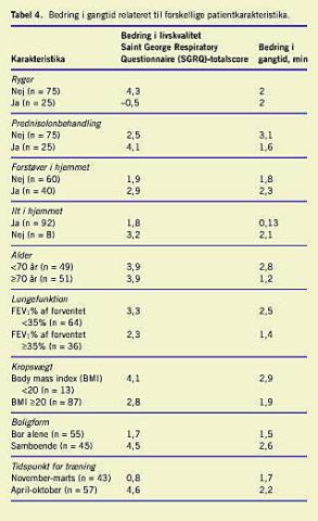 Vi undersøgte, om man med bestemte patientkarakteristika kunne forudsige effekt af rehabilitering på livskvalitet og gangtid. Selv om ingen af de valgte variabler havde en signifikant prædiktiv værdi med hensyn til respons på rehabilitering, så det ud til, at behandling med ilt i hjemmet var relateret til dårlig respons på rehabilitering. Den del af livskvaliteten hos iltbrugerne, som beskriver aktiviteter (acti- vity -domænet), blev forbedret signifikant under træningen (scoredifference på 4,3), men samtidig oplevede patienterne en yderligere reduktion i livskvaliteten inden for de to andre domæner. Rygere bedrede deres gangtider på linje med ikkerygere, men de opnåede ikke nogen bedring i livskvaliteten.