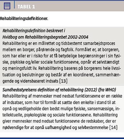 I Danmark findes der to definitioner af rehabilitering. Sundhedsstyrelsens, der er en oversættelse af WHO’s [12], og en definitionen fra »Hvidbog om rehabiliteringsbegrebet« [13] (Tabel 1).