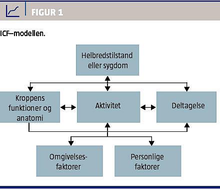 International Classification of Diseases (ICD)-klassifikationen har været et uvurderligt redskab i lægers udvikling af diagnostik og behandling på sygehusene. Imidlertid angiver sygdomsdiagnosen ikke, hvordan sygdommen påvirker funktionsevnen. Behov for genoptræning, hjælpemidler, boligændringer, tilretning af arbejdsplads, personlig assistance mv. efter initial sygdomsbehandling afhænger ikke alene af diagnose og stadium. ICD-klassifikationen kan således kun være ét af flere væsentlige bidrag til planlægning og gennemførelse af rehabiliteringsforløb. Bl.a. i lyset af denne erkendelse udarbejdede WHO den bio-psyko-sociale ICF-model – og på dette fundament ICF-klassifikationen [11]. ICF-modellen og -klassifikationen er tænkt som hhv. en referenceramme og et redskab, der kan bruges til beskrivelse af funktionsevnen i et helhedsperspektiv – i en tværfaglig og tværsektoriel kontekst.