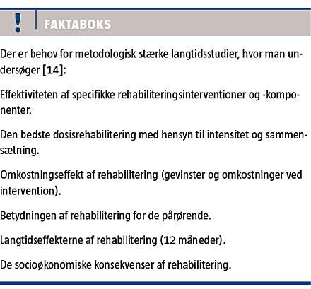 f.eks. ergoterapi [18] og neuropsykologisk intervention [19], mindre overbevisende. Generelt må det siges, at evidensen for de monofaglige interventioner er temmelig mangelfuld, bortset fra fysioterapi, som har vist god effekt på træthed, humør og livskvalitet [20, 21]. I 2011 udkom en opdateret version af Cochraneoversigtsartiklen fra 2007. I den opdaterede version var der medtaget to nye studier, hvor man undersøgte effekten hos patienter, der fik rehabilitering under indlæggelse, kontra patienter på venteliste. Studierne var desværre af lavere kvalitet, så opdateringen gav ikke anledning til at ændre på konklusionerne fra 2007. I den opdaterede Cochraneoversigtsartikel efterspurgtes der nok engang metodologisk stærke langtids-RCT’er, hvor man undersøger flere aspekter af rehabilitering. Den nuværende evidens viser, at rehabilitering under indlæggelse er ambulant eller hjemmebaseret rehabilitering overlegen, og anbefalingen må da være, at rehabilitering bør tilbydes som forløb med indlæggelse og optimalt med efterfølgende systematisk opfølgning for bedst muligt at bevare de gevinster, der blev opnået under indlæggelse [22].