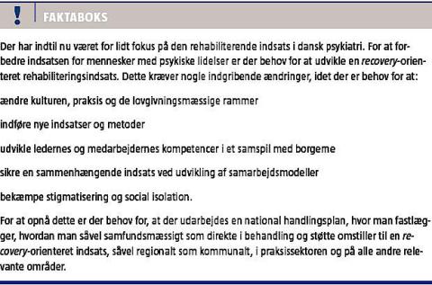 implementeres med henblik på at sikre en recovery-orienteret indsats i behandlings- og socialpsykiatrien, en bedre beskæftigelsesrettet indsats og en bedre indsats i almen praksis. Samtaleydelsen i almen praksis bør tilpasses, så det er muligt at tilbyde en rehabiliterende indsats til mennesker med psykiske lidelser.
