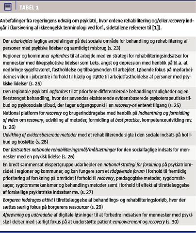 I anbefalingerne indgår rehabilitering og recovery også flere steder, jf. Tabel 1, hvor de forslag fra udvalget, hvor ordene rehabilitering og recovery er nævnt, gengives. På trods af rapportens redegørelse om rehabilitering og recovery forekommer udvalgets konkrete anbefalinger på området ud fra en faglig vurdering at være fragmenterede og upræcise. Begrundelsen for dette skal formentlig findes i de politiske kompromiser, der har været nødvendige, men ud fra et fagligt synspunkt er det betænkeligt, at anbefalingerne ikke i langt højere grad afspejler ovenstående og de internationale anbefalinger på området, da rapportens erklærede formål er at udstikke rammerne for den kommende udvikling på det psykiatriske område.