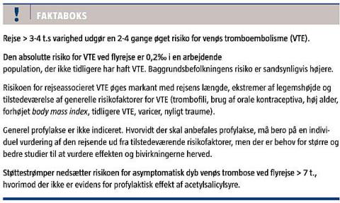 Fjerne rejsedestinationer er gjort økonomisk og praktisk let tilgængelige over de seneste årtier, og befolkningens rejseaktivitet er tiltaget tilsvarende. Langvarig rejseaktivitet blev allerede i 1950’erne sat i relation til udvikling af dyb venøs trombose (DVT) [1, 2]. I nærværende statusartikel belyses sammenhængen mellem rejse og venøs tromboembolisme (VTE) med fokus på risiko, disponerende faktorer og profylaktiske tiltag.