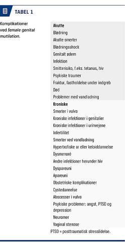 Der findes meget få valide kvantitative opgørelser over komplikationer efter FGM. Dette beror blandt andet på, at flere af de lande, hvor FGM forekommer hyppigst, er blandt de fattigste lande i verden, hvor adgang til data og opfølgning er sporadisk. Således bygger flere artikler på data om komplikationer i forbindelse med obstetriske procedurer opsamlet i industrialiserede lande eller fra mindre kohorter i de lande, hvor indgrebene hyppigst finder sted [12, 15]. Den yderste konsekvens af FGM er selvsagt død. Mortaliteten ved FGM er anslået til at være en ud af 500, hvilket således ganske tankevækkende, når der foretages FGM på ca. 6.000 om dagen [16]. En oversigt over komplikationer kan ses i Tabel 1. Overordnet kan man opdele komplikationerne i akutte og kroniske. Komplikationerne grupperer sig i fysiske og psykiske. Således ses der i relation til de psykiske angst, posttraumatisk stresslidelse (PTSD) og depression, men også skam over fysisk fremtoning er en hyppig klage [17, 18]. Blandt de fysiske komplikationer dominerer smerter i vulva og de urologiske, gynækologiske og obstetriske gener [12, 15].