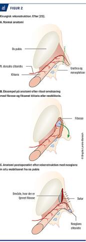 De første klitorisrekonstruktioner efter FGM blev beskrevet af Thabet og Foldés [22-24]. Foldés et al foretog rekonstruktioner hos kvinder, der havde været udsat for FGM-type II-III. Konkomitant deinfibulation kan udføres, hvis det er nødvendigt. Første skridt er at lokalisere den resterende del af klitoris. Derpå foretages der excision af huden over den distale den af klitorisskaftet og derefter mobilisering i kranial retning under hensyntagen til nerver. Arvæv og fibrose fjernes. Ligamentum suspensorium clitoridis overskæres ved sin basis ved symphysis pubis for at muliggøre mobilisering af klitorisskaftet i kaudal retning, hvorved der skabes en såkaldt »neoklitorisglans«, som fikseres i sin anatomiske normale position. Herefter lukkes huden over vestibulum vaginae (Figur 2). I alt beskriver Foldés et al rekonstruktion efter FGM hos 2.938 kvinder i perioden 1998-2009. Kun 866 (29%) besvarede etårsfollowup, men 821 svarede, at de havde oplevet smertereduktion, og 815 svarede, at de havde opnået et forbedret seksuelt samliv pga. følelse i den rekonstruerede klitoris. Flere centre i verden benytter variationer af ovenstående teknik, når der udføres rekonstruktive indgreb efter FGM. Der er dog et aber dabei, idet Berg et al fandt, at op mod en femtedel af de kvinder, som havde fået foretaget rekonstruktion, oplevede forværring af seksuallivet efter rekonstruktionen [10, 25], og Ezebialu et al i et nyere studie måtte opgive at finde velegnede randomiserede studier til at indgå i en analyse om effekten af rekonstruktion efter FGM ift. smerter [26].