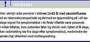 Endvidere kunne man overveje, om kortere rekonvalescensperiode og dermed hurtige genoptagelse af arbejde var en mulighed. For taler, at symptomerne i slutningen af sygdommen er relativt milde; imod taler, at mange patienter ikke føler, at de er fuldt arbejdsdygtige, når de genoptager arbejdet. Endelig adskiller influenza sig fra de fleste andre sygdomme ved, at smitsomheden er meget høj. Den gennemsnitlige varighed af virusudski llelse i eksperimentel influenza er omkring fem dage efter eksposition, svarende til fire dage efter symptomdebut [10]. Efter syv dage er de fleste holdt op med at udskille virus.