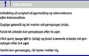 Rekonvalescensperioden og behovet for sygemelding efter kolonresektion har ændret sig i takt med implementering af den nyeste evidens i klinisk praksis. Det er vist gennem de seneste 12 år, at når patienter efter kolonresektion plejes og behandles efter principperne for accelererede operationsforløb med optimering af den præoperative forberedelse af patienten, smertebehandling og anæstesi, intensiv mobilisering, tidlig ernæring og reduktion af det kirurgisk stressrespons, er det muligt at nedsætte rekonvalescensperioden signifikant. Årsagen er en hurtigere restituering af operationspatienten med færre medicinske komplikationer til følge, ligesom den vanlige træthed bliver mindsket signifikant. Denne patofysiologiske baggrund har dannet basis for de anbefalinger for rekonvalescens og sygemelding, der fremgår af faktaboksen. Anbefalingerne har været gældende de seneste 12 år i Gastroenheden på Hvidovre Hospital, og de har vist sig at være realistiske og sikre, hvilket selvfølgelig er under forudsætning af en individuel vejledning.