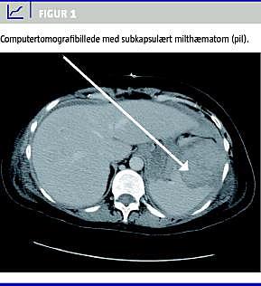 Under indgrebet blev der konstateret en større mængde såvel friskt som gammelt blod i abdomen, samt en tredjedel løsning af placenta. Da blødningskilden ikke kunne identificeres, blev den abdominalkirurgiske bagvagt tilkaldt. Under gennemgang af alle relevante strukturer blev der påvist en lille avulsion af miltens frie laterale kant. Der kunne ikke konstateres igangværende blødning, og fundet blev anført som et tidligere traume. Patienten var herefter somatisk stabil. Der blev foretaget CT med kontrast af thorax og abdomen, hvilket viste en grad III-miltskade, med et 5 × 7 cm intrasplenisk hæmatom og intakt kapsel (Figur 1 ).