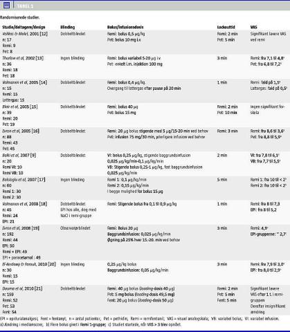 Ved gennemgang af litteraturen har vi fundet frem til 21 studier med 2.382 kvinder, som fik remifentanil som fødselsanalgesi. Elleve af disse studier var randomiserede kliniske forsøg [9, 12-21] (Tabel 1 ), seks var prospektive observationelle studier [22-27], og fire var retrospektive studier [28-31] (Tabel 2 ). Der er et vist overlap mellem de fire retrospektive studier fra Ulster Hospital, Belfast, idet alle data er indsamlet fra Northern Ireland Maternitys system i perioden 2002-2008. Vi har derfor kun anvendt det største af studierne i Tabel 2 [28].