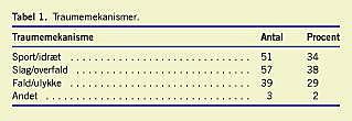 Patienterne blev bedt om at angive skadesmekanisme for næsebruddet. Enoghalvtreds (34%) patienter angav, at frakturen skyldtes sport eller idræt. Syvoghalvtreds (38%) patienter angav, at frakturen skyldtes slag eller overfald. Niogtredive (26%) patienter var faldet eller fik bruddet ved en ulykke, mens tre (2%) patienter valgte kategorien andet og angav, at de for eksempel havde pådraget sig næsefrakturen ved løb mod en dør eller spark af en ko (Tabel 1 ).