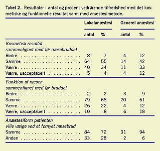 Resultater: Den hyppigste skademekanisme var slag og overfald. Intervallet fra traumet til repositionen var i gennemsnit 4,1 dage. 60% af patienterne bemærkede, at næsen havde samme eller bedre udseende end før frakturen uanset anæstesimetoden, mens 69% af patienter oplevede at næsens funktion var lige så god eller forbedret.
