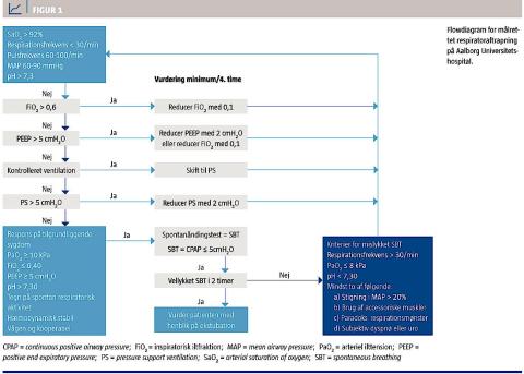 Det rekommanderes, at der benyttes systematiske protokoller for respiratoraftrapning, idet dette medfører en reduktion af den samlede varighed af respiratorbehandlingen [16, 20-24]. Protokollerne kan være enten et klinisk vejledende dokument, som styres at det sundhedsfaglige personale (et eksempel fra Aalborg Universitetshospital er vist i Figur 1) eller
