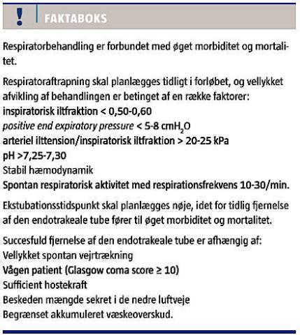 Tidsfaktoren er i denne sammenhæng af stor betydning, hvorfor der ud over omhyggelig indikationsstilling er behov for retningslinjer for aftrapning af respiratorbehandling, således at varigheden af denne ikke bliver unødigt lang [4].