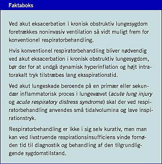 En anden metode til rekruttering af kollaberet lungevæv er respiratorbehandling med patienten i bugleje. Selv om disse tiltag, som efterhånden anvendes rutinemæssigt i klinisk praksis, fører til forbedring af oxygeneringsevnen, er der endnu ingen evidens for, at de bedrer prognosen, hverken hvad angår overlevelse eller restitution. Det samme gælder i øvrigt tiltag som inhalation af nitrogenoxid (NO) og prostacyklin, der begge sigter mod at reducere shunt ved at omdirigere blod fra ikkeventilerede til ventilerede lungeafsnit [8]. En vigtig implikation heraf er, at forekomst af hypoksæmi, medmindre den er meget svær, næppe i sig selv er afgørende for, hvorvidt patienten overlever. Derimod er der evidens for, at det har gavnlig effekt under respiratorbehandling at begrænse såvel inspiratoriske luftvejstryk (til højst 30-35 cmH2O) som tidalvolumina (til højst 6 ml/kg ideal legemsvægt), idet risikoen for sekundær, ofte mikroskopisk beskadigelse af lungevæv forårsaget af respiratorbehandlingen herved mindskes. En sådan sekundær lungeskade vil kunne initiere eller forstærke et systemisk inflammatorisk respons med multiorgandysfunktion og død til følge [9]. I en stor, randomiseret, kontrolleret klinisk undersøgelse fandt man således ved respiratorbehandling med sådanne begrænsninger sammenlignet med ved mere konventionelle respiratorindstillinger en absolut mortalitetsreduktion på 10% [10]. Med begrænsninger som anført vil det imidlertid ofte ikke være muligt i fuldt omfang at eliminere CO2, hvorfor hyperkapni til en vis grad må og kan accepteres. Ventilation ud fra disse principper omtales derfor også undertiden som permissive hypercapnia. Hyperkapni kan dog volde problemer for patienter med truende eller manifest forhøjelse af det intrakraniale tryk.