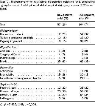 Syvoghalvtreds børn var RSV-positive (26%), og 164 var RSV-negative. I Tabel 1 vises fordelingen af risikomarkører for udvikling af astmatisk bronkitis, objektive fund, behandling og sygdomsforløb i forhold til resultatet af RSV-testen.