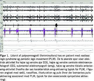 Hos ca. 80% med RLS forekommer der motoriske fænomener med periodiske benbevægelser (Figur 1 ), eventuelt natlige kramper især i benene. PLM forekommer også ved søvnapnø, narkolepsi og andre søvn- og neurologiske sygdomme, for eksempel Parkinsons sygdom, men også ved andre neuro-degenerative og hereditære sygdomme. PLM kan også forekomme hos personer uden andre symptomer. PLM er derfor ikke specifikt for RLS [2].