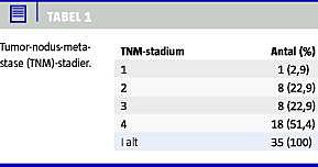 Patienternes fordeling på tumor-nodus-metastase (TNM)-stadium fremgår af Tabel 1 .