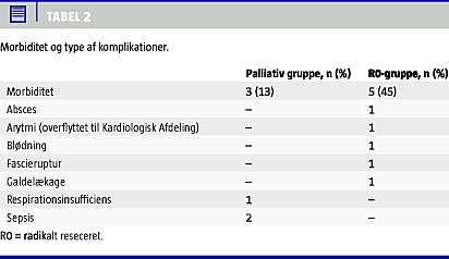 Der var ingen signifikant forskel i den postoperative indlæggelsestid eller morbiditet mellem R0-gruppen og den palliative gruppe. Dette kan forekomme overraskende set i lyset af forskellen i omfanget af de udførte indgreb, men generelt set var patienterne i den palliative gruppe i dårligere almentilstand på operationstidspunktet. Morbiditetsraten og typen af komplikationer var sammenlignelig med data fra andre studier [3, 8, 9].
