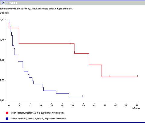 Der var en signifikant længere overlevelse i R0-gruppen end i den palliative gruppe (p = 0,0002). Den mediane overlevelse i R0-gruppen var 45 måneder (6- ) mod 5,3 måneder (2-11) i den palliative gruppe. Den mediane observationstid for de overlevende patienter var 42 måneder (spændvidde 35-73 måneder), og den estimerede et-, tre- og femårsoverlevelse var henholdsvis 73% (konfidensinterval (KI) 37-90), 73% (KI 37-90) og 31% (KI 5-63%) i R0-gruppen (Figur 1 ).