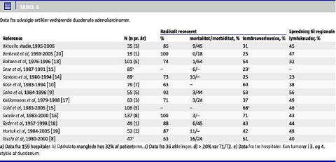 Materiale og metoder: Alle patienter, der blev undersøgt og behandlet for duodenal cancer (DC) på Øvre Gastrointestinale (GI) Sektion, Kirurgisk Afdeling A, Odense Universitetshospital, i perioden fra januar 1995 til februar 2006, blev retrospektivt identificeret og gennemgået. Tumorer fra caput pancreatis, papilla Vateri, distale galdeveje eller tumorinfiltration fra omkringliggende organer (ud over duodenum) blev ekskluderet.